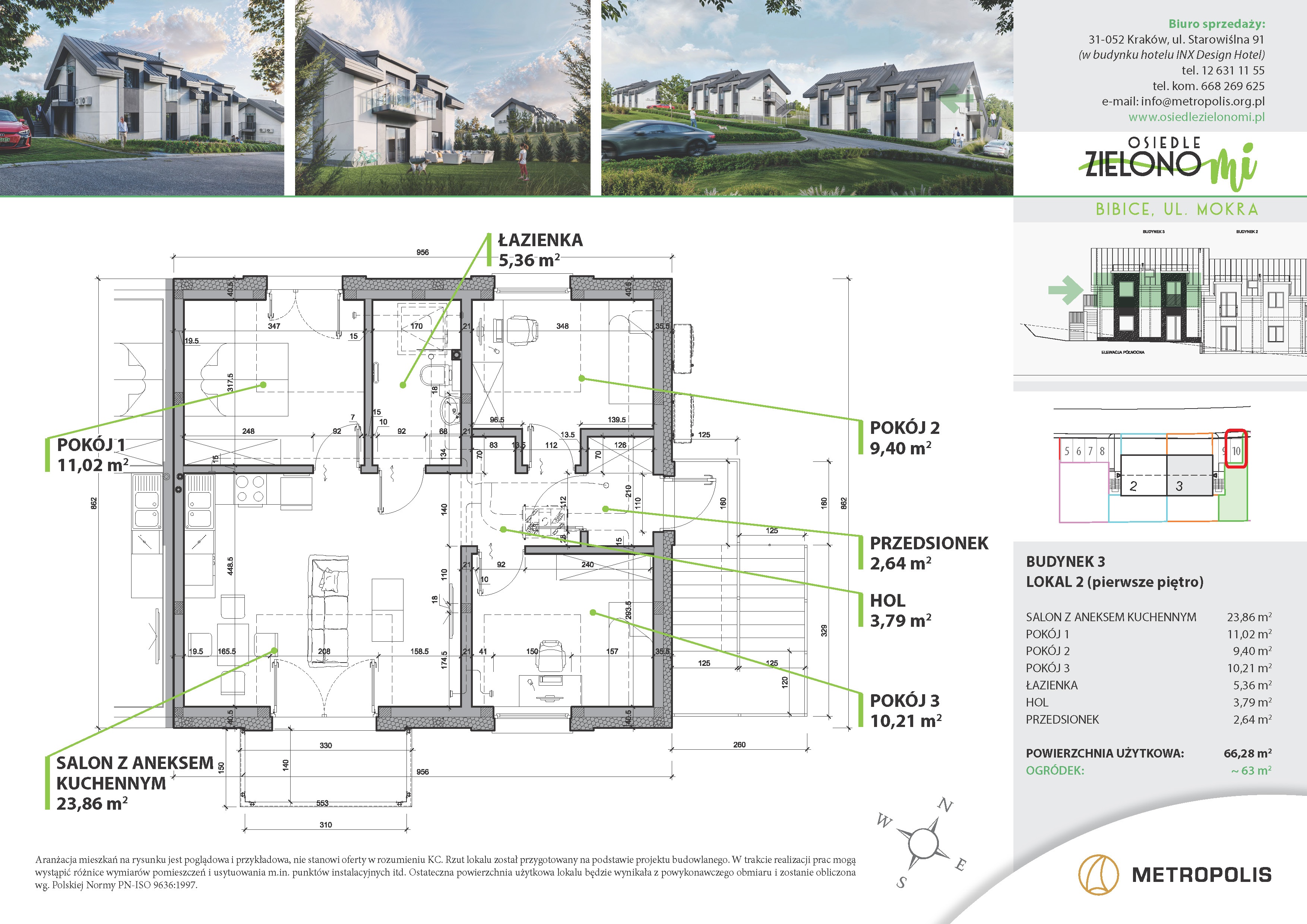 – na piętrze o pow. 66,28 m² z balkonem oraz przynależnym prywatnym ogródkiem obok budynku. Mieszkania zostały tak zaprojektowane, aby posiadały salon z aneksem kuchennym oraz trzy sypialnie.